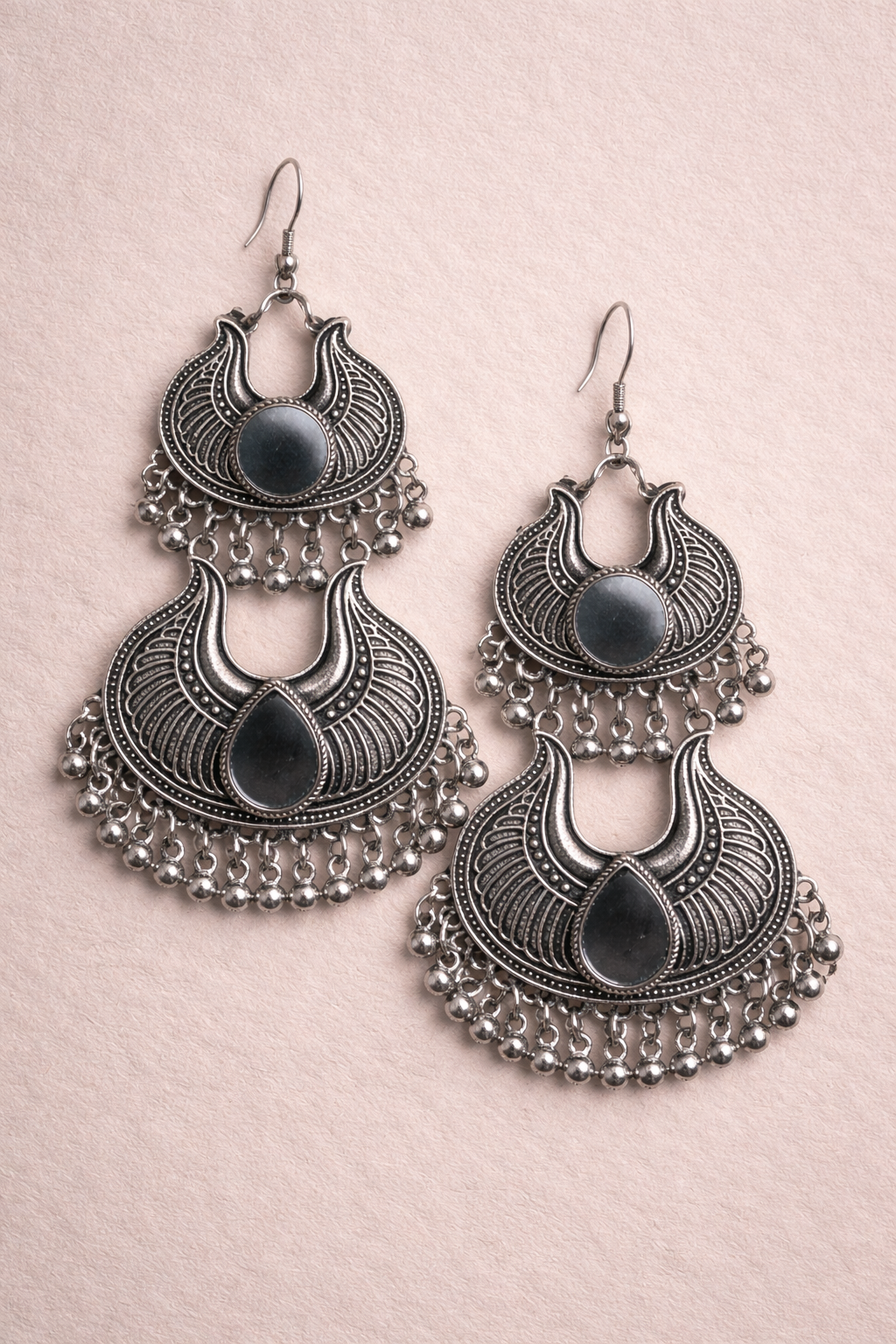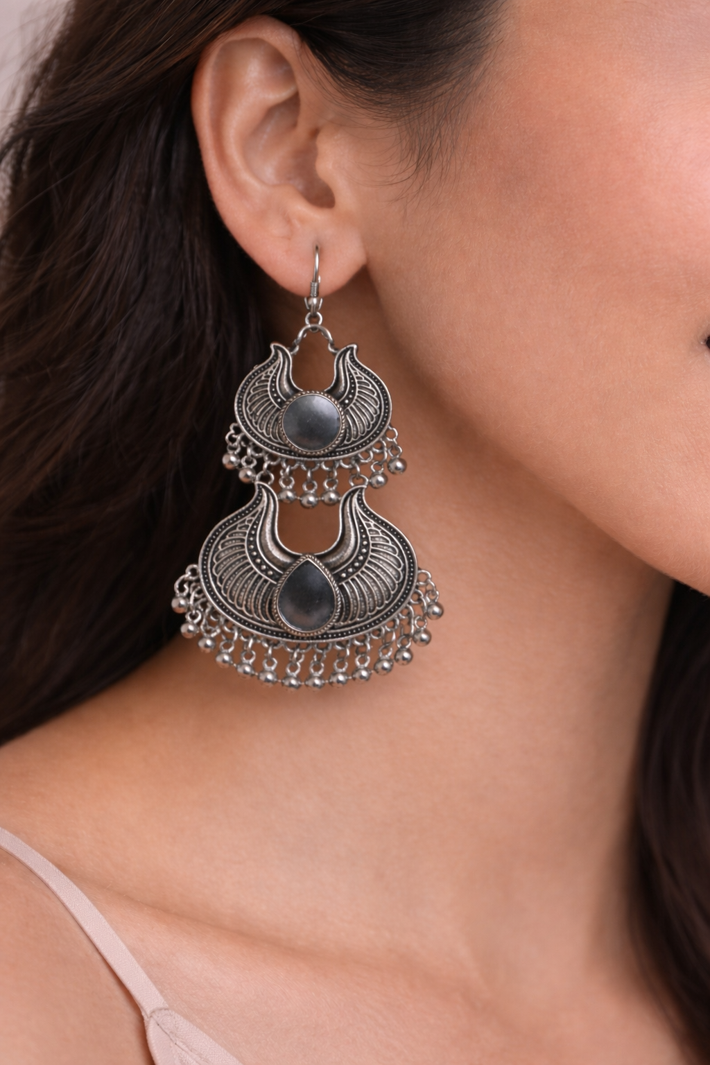 Elevate your ethnic and boho looks with these stunning Antique Oxidized Crescent Moon Statement Earrings. Featuring a bold crescent silhouette with intricate engraved detailing and cascading ghungroo beads, this design draws inspiration from tribal and vintage Indian jewellery.