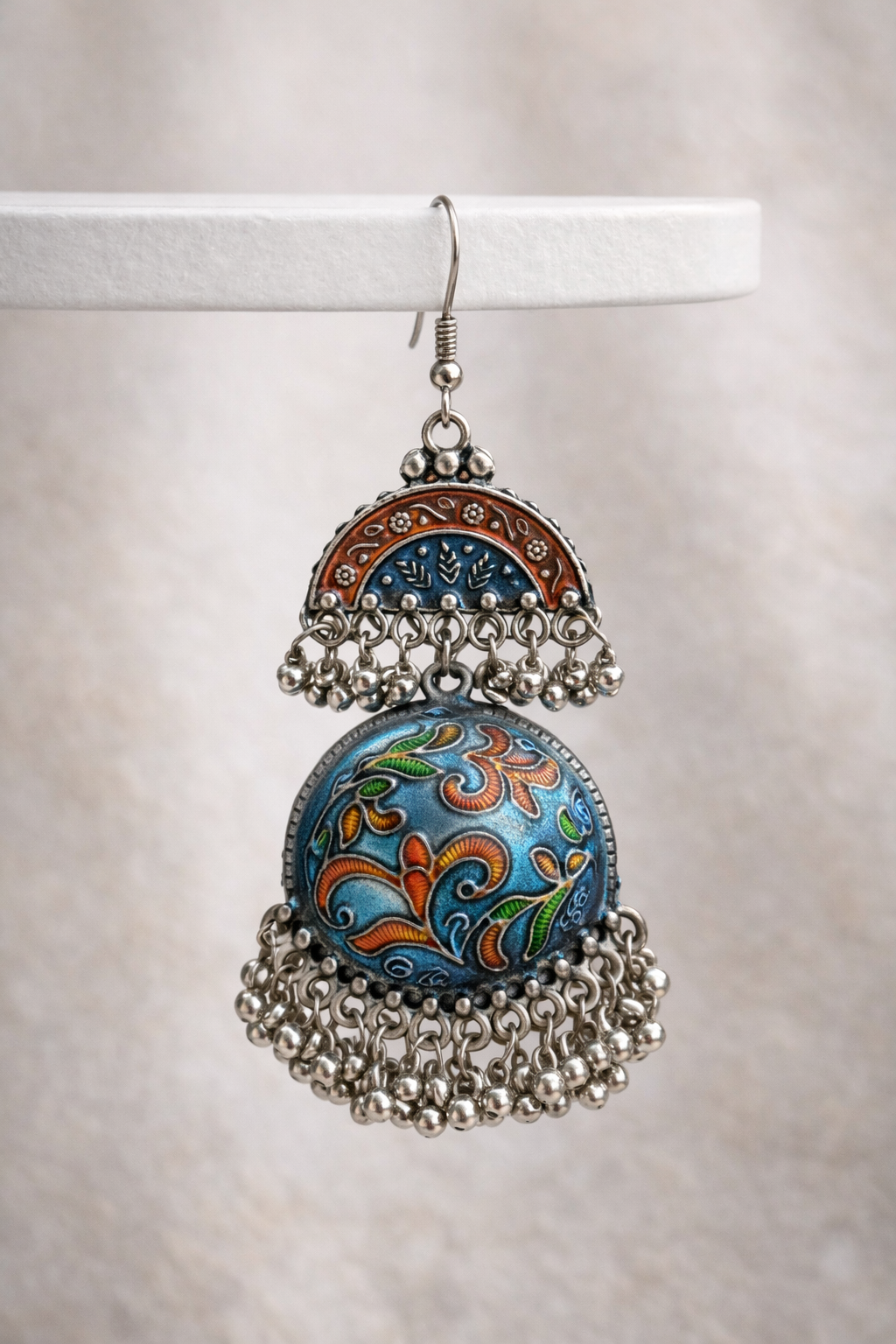 Celebrate artisanal beauty with this Handcrafted Enamel Art Oxidized Jhumka Earring. Featuring a richly hand-painted dome with intricate floral motifs in vibrant blue, orange, and green hues, this earring reflects traditional craftsmanship with a contemporary edge.