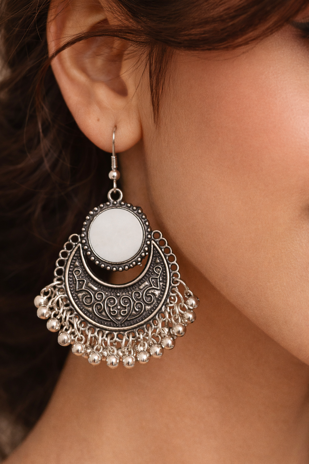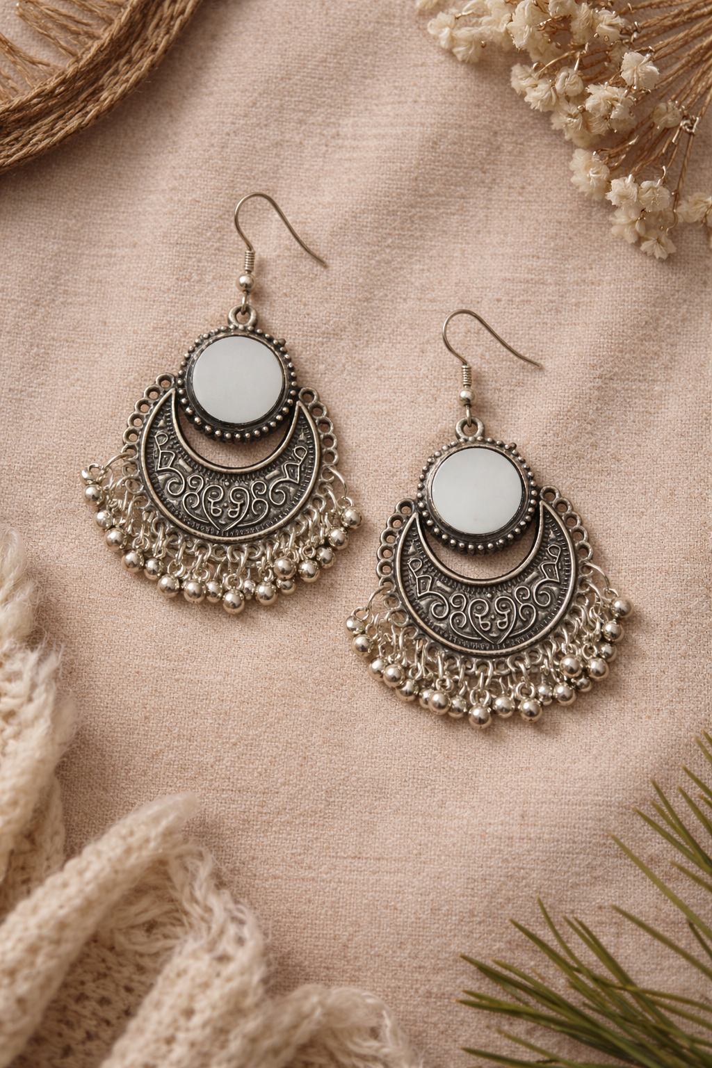 The oxidized silver finish gives these earrings a vintage character, while the reflective mirror adds a subtle glow that enhances both festive and everyday outfits. Perfect for pairing with sarees, kurtas, lehengas, or Indo-western ensembles.