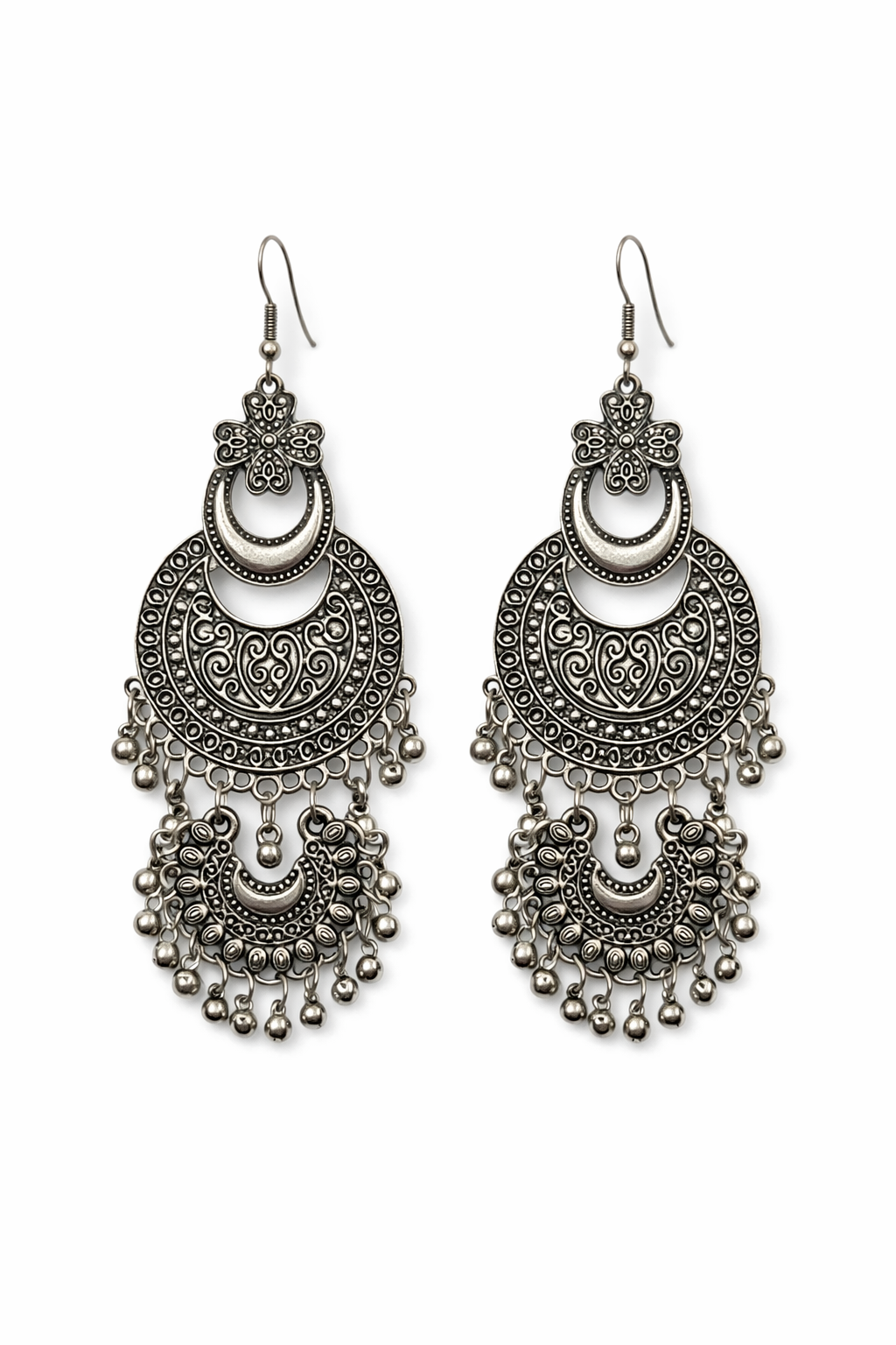 Make a timeless style statement with these exquisitely crafted oxidised chandbali earrings. Featuring a delicate floral stud top and beautifully layered crescent motifs, these earrings are finished with tiny ghungroo-style bead danglers that add graceful movement.