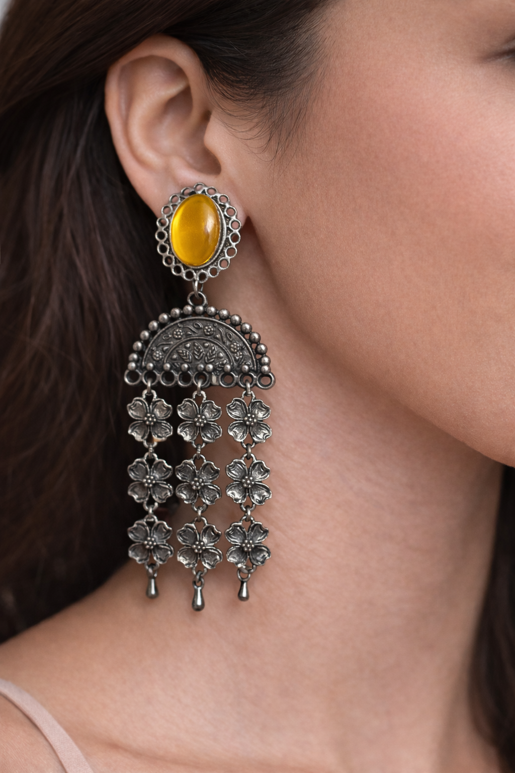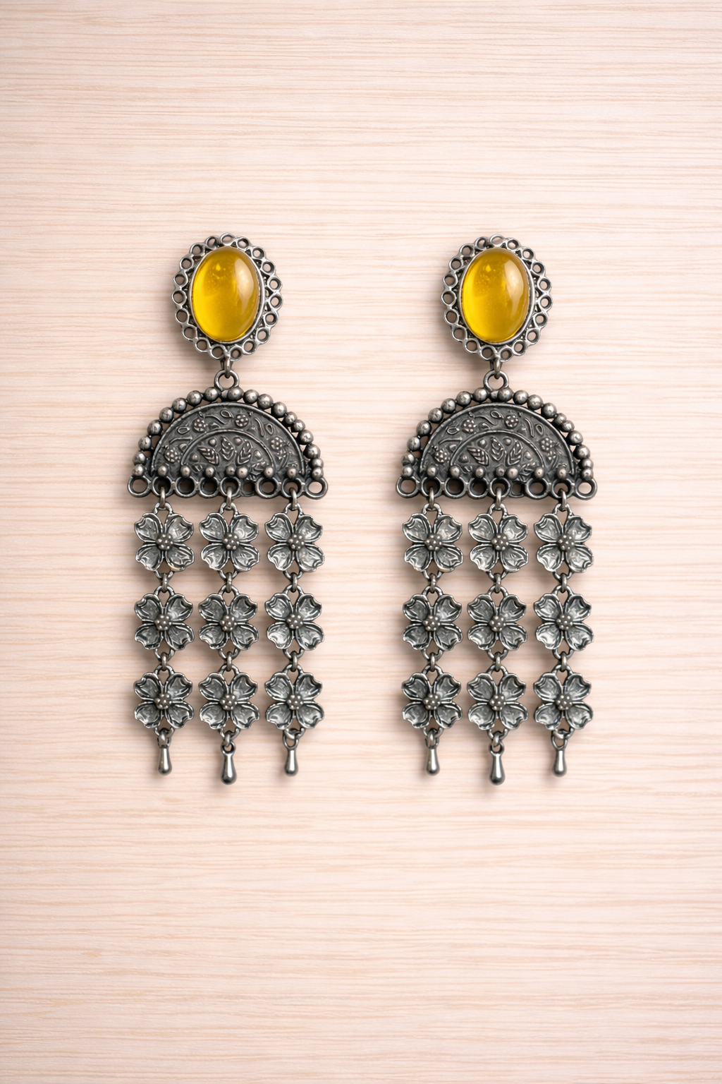 These Oxidised Silver Chandbali Earrings with Yellow Stone beautifully combine vintage charm with artistic floral detailing. The oval yellow cabochon stone at the top adds a vibrant pop of color, while the engraved crescent-shaped chandbali base showcases traditional oxidised craftsmanship.