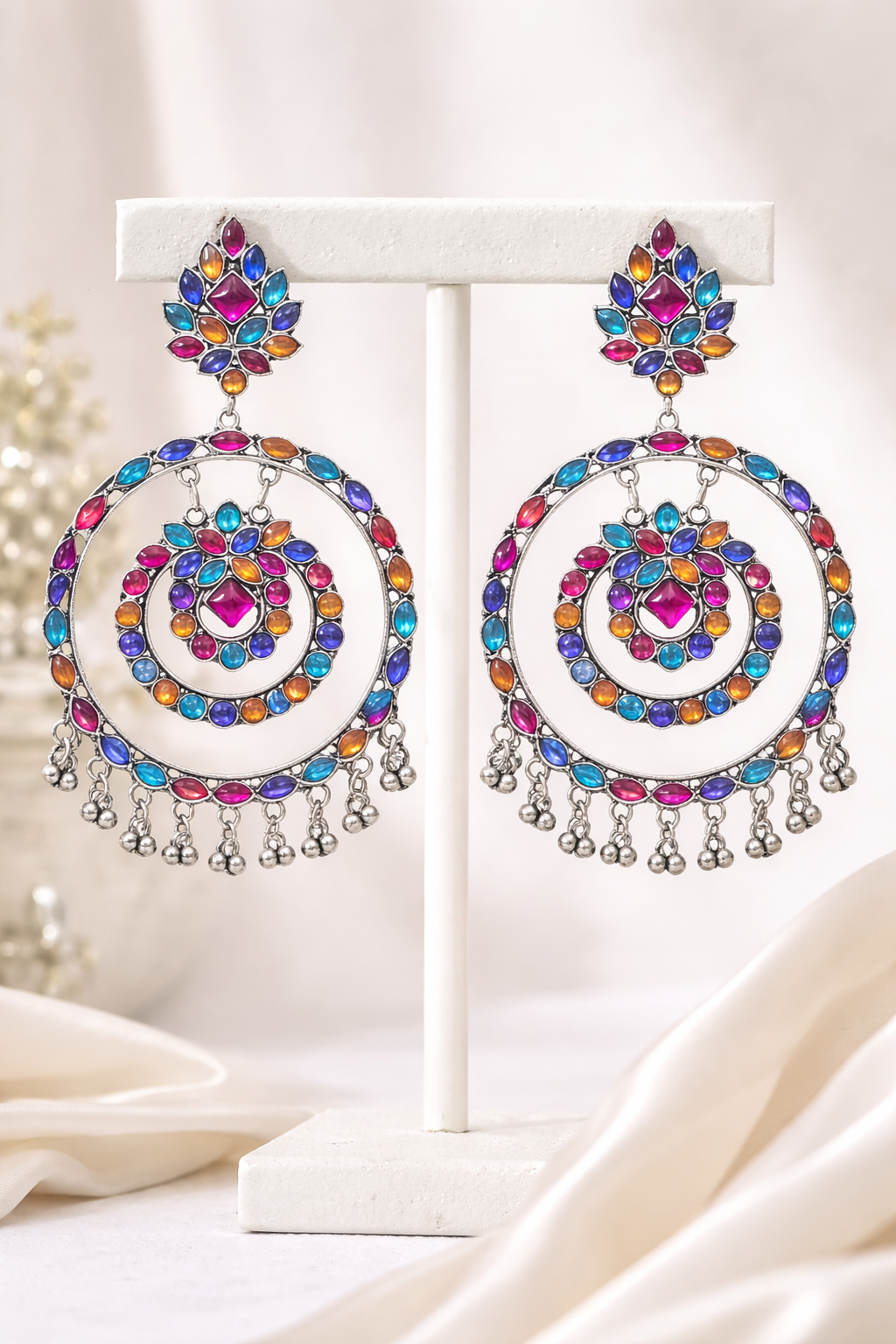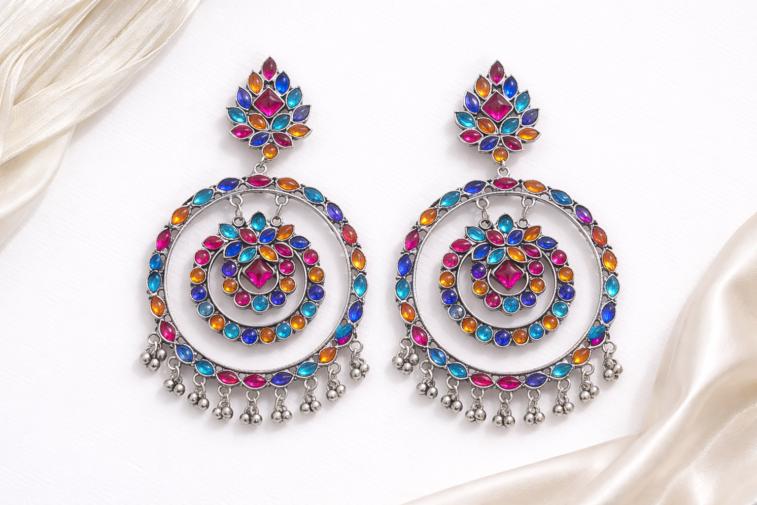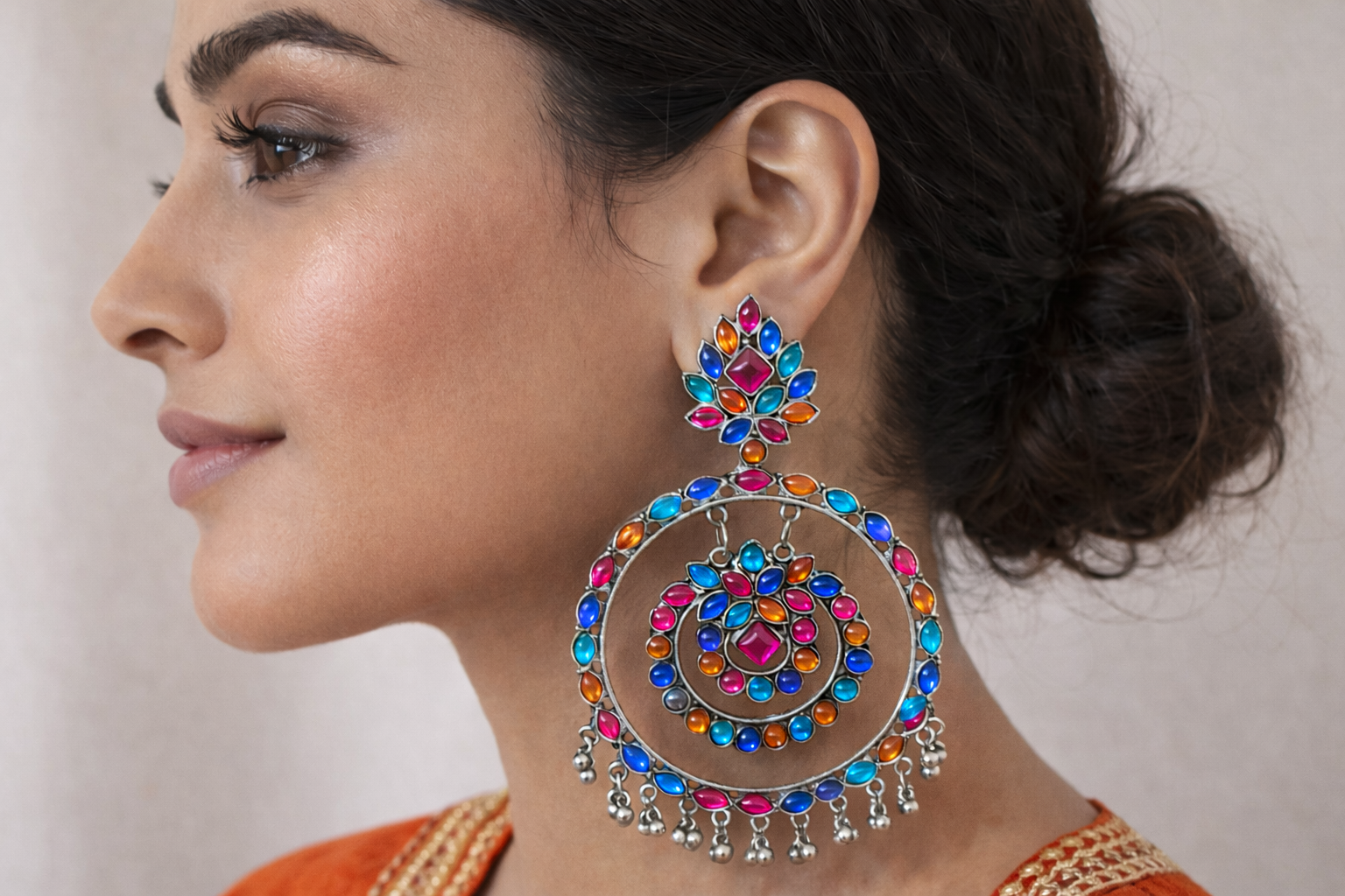Crafted in an antique oxidized silver finish, these earrings are perfect for festive occasions, celebrations, weddings, and statement Indo-western styling. Despite their bold appearance, they are thoughtfully designed to remain comfortable for extended wear.