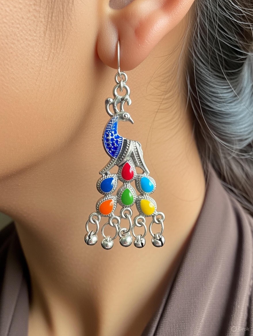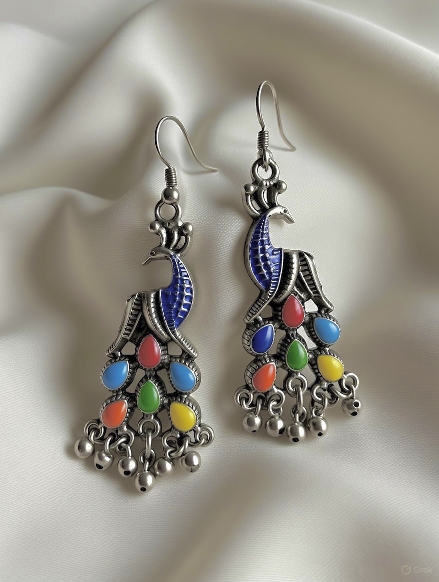 Celebrate colour and craftsmanship with these stunning peacock motif oxidized silver dangler earrings. Designed with a graceful peacock silhouette at the top and cascading multicolour enamel stones below, these earrings beautifully capture traditional artistry with a playful, vibrant twist.