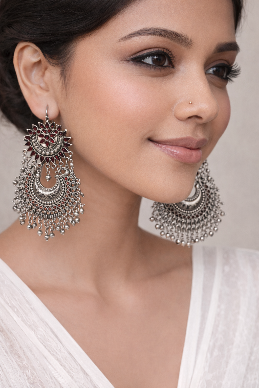 Add a touch of regal elegance to your ethnic wardrobe with these Oxidized Chandbali Earrings, beautifully crafted in a traditional crescent silhouette. Highlighted with rich maroon stone detailing and finished with delicate ghungroo-style bead drops, these earrings reflect timeless Indian craftsmanship.