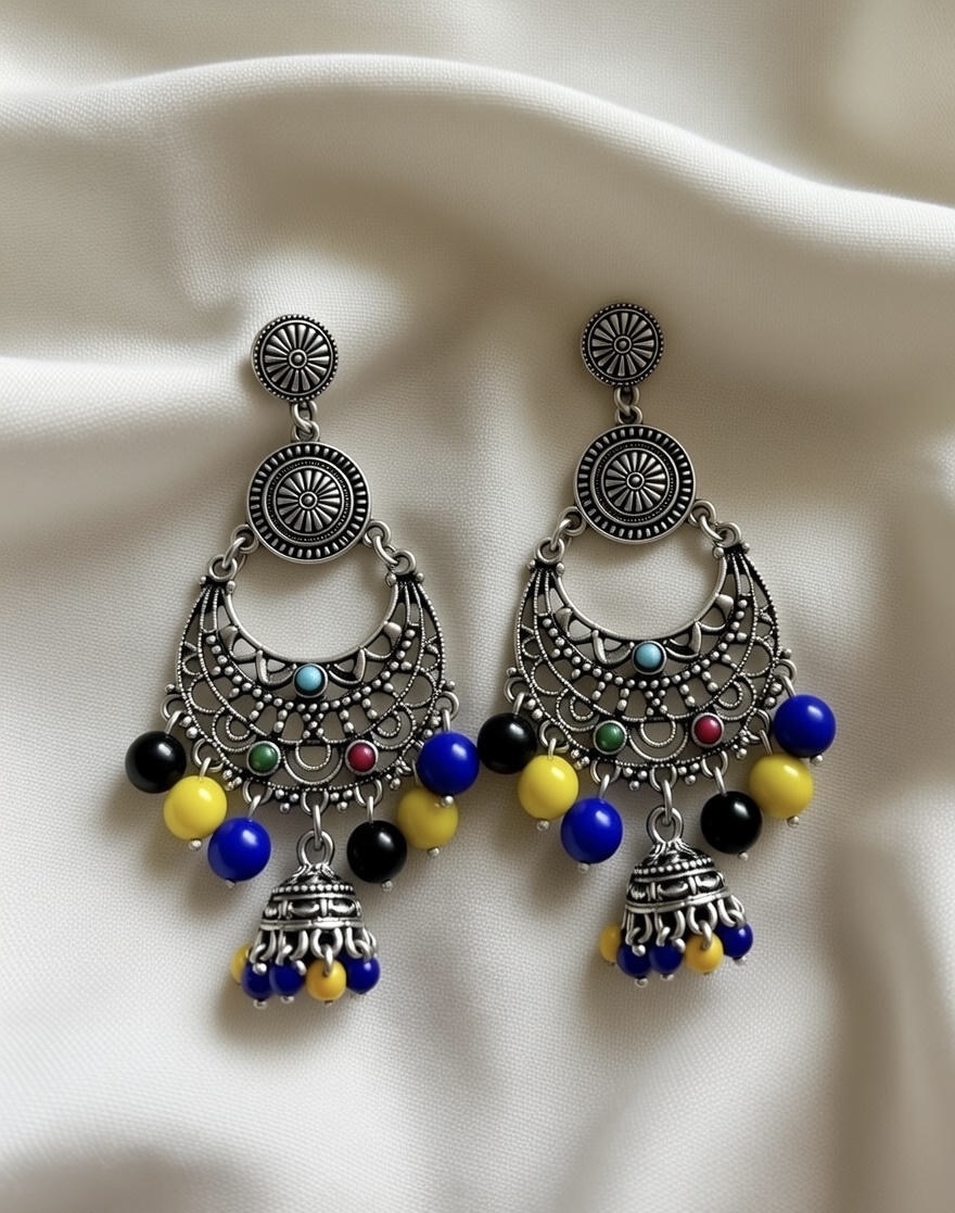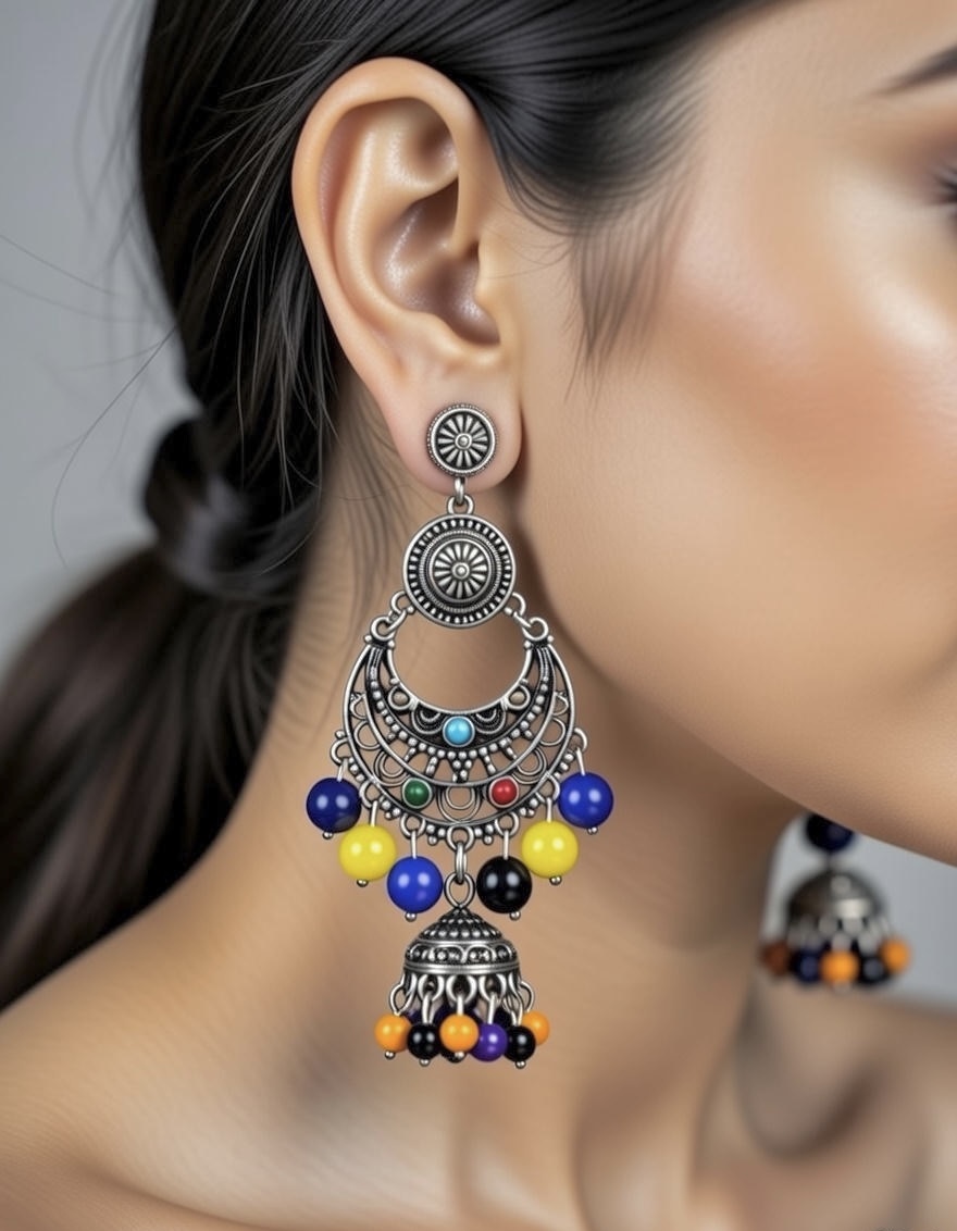 These Oxidized Multicolor Beaded Jhumka Drop Earrings beautifully combine traditional Indian craftsmanship with a playful contemporary touch. Featuring intricately carved circular studs, crescent-inspired detailing, and classic jhumka danglers, the earrings are accented with vibrant multicolor beads that add charm and movement. Finished in antique silver, they are perfect for elevating everyday ethnic looks as well as festive and Indo-western outfits.