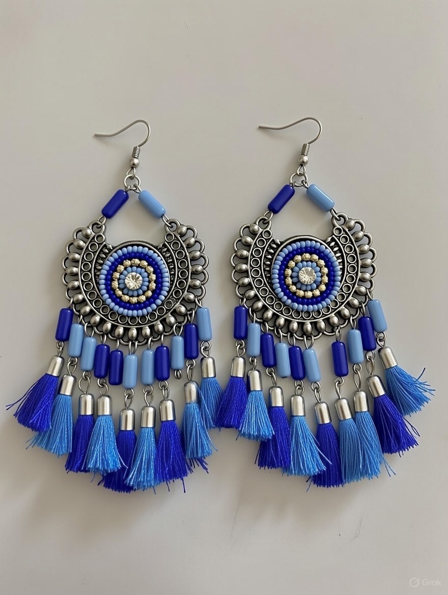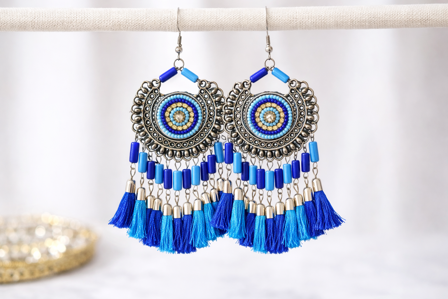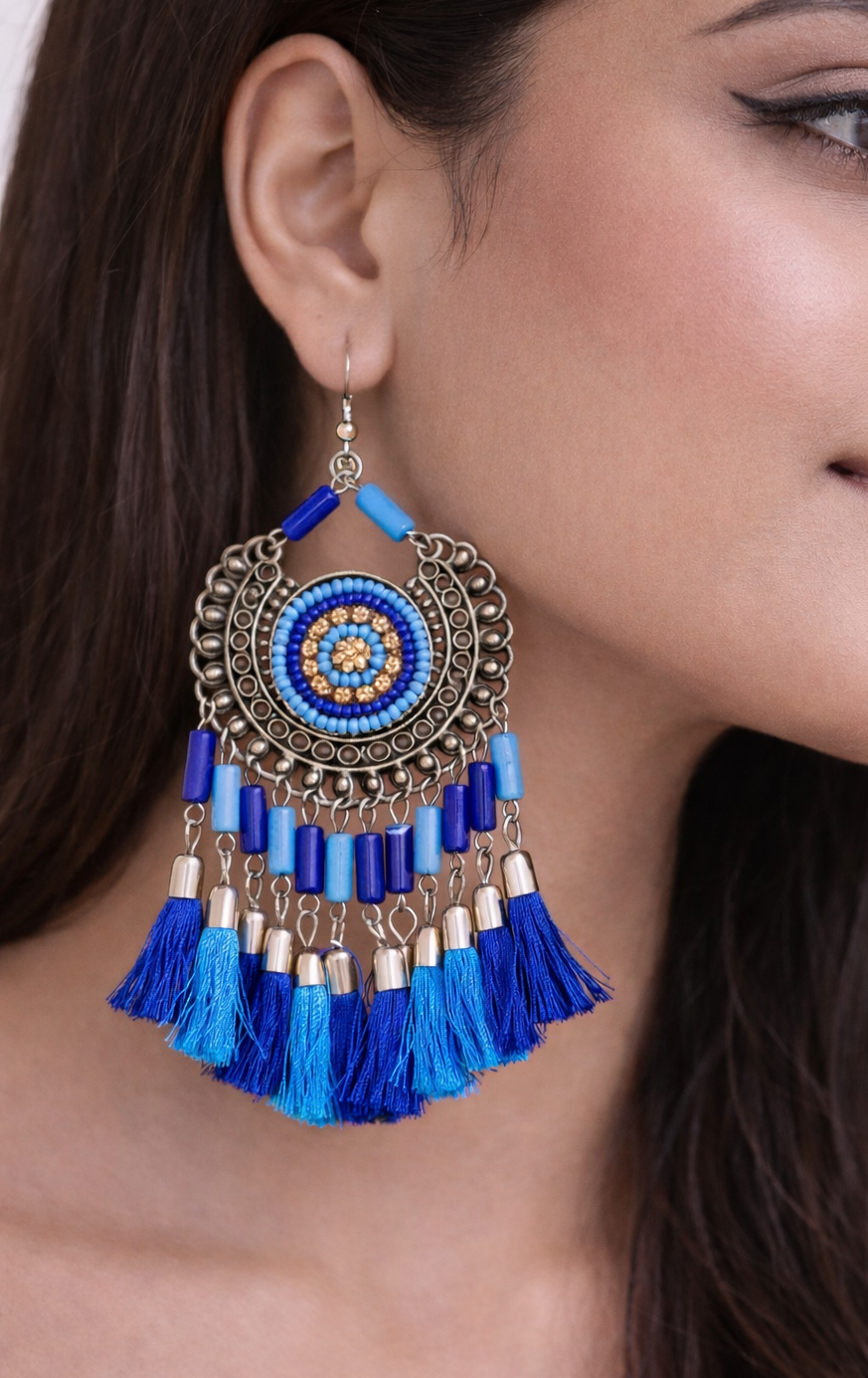 Add a pop of vibrant elegance to your look with these Royal Blue Beaded Tassel Statement Earrings. Designed with concentric beadwork in rich blue tones and finished with flowing silk tassels, these earrings bring together boho charm and ethnic craftsmanship.