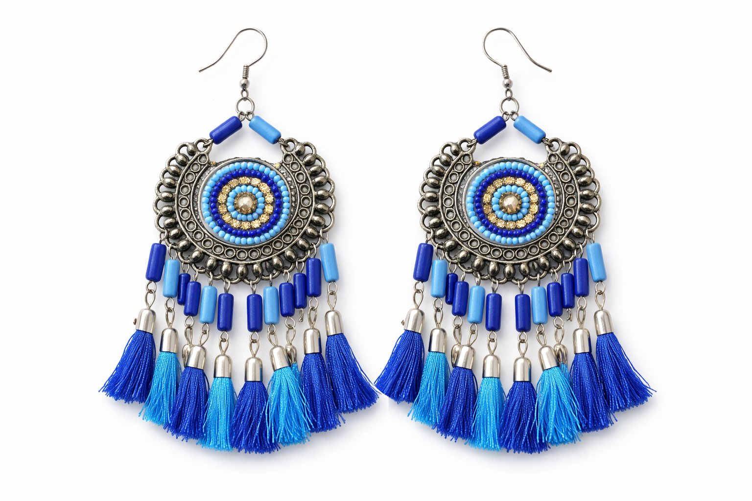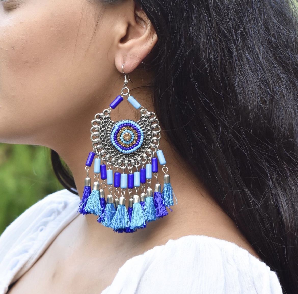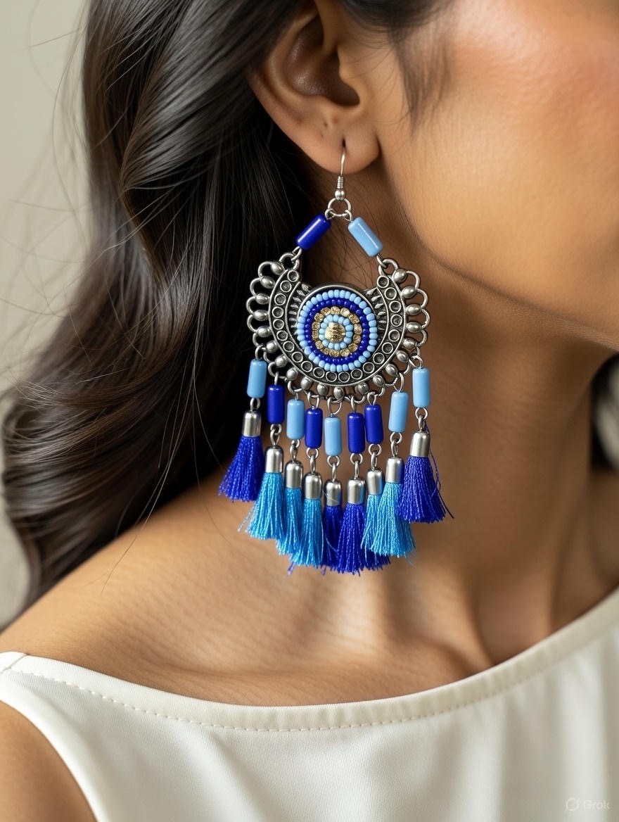 Add a pop of vibrant elegance to your look with these Royal Blue Beaded Tassel Statement Earrings. Designed with concentric beadwork in rich blue tones and finished with flowing silk tassels, these earrings bring together boho charm and ethnic craftsmanship.