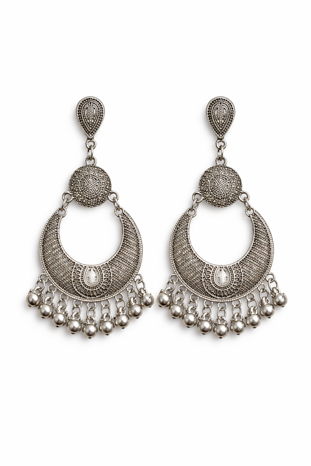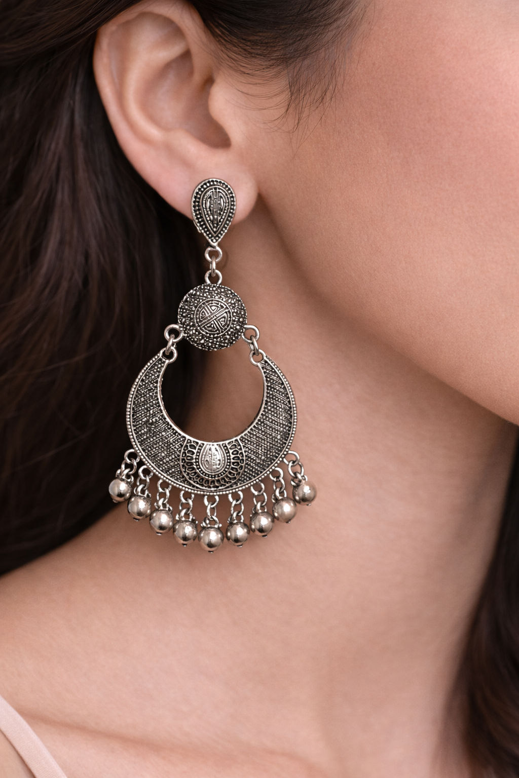 These Oxidized Silver Crescent Drop Earrings feature an intricately engraved crescent silhouette paired with delicate ghungroo bead drops that add graceful movement. The antique oxidized finish highlights traditional craftsmanship, making these earrings a timeless addition to any ethnic jewelry collection.