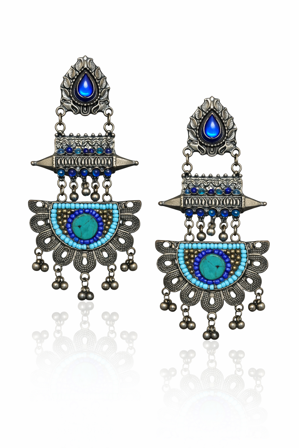 Make a bold ethnic statement with these Turquoise Aura Oxidized Statement Drop Earrings. Featuring layered oxidized motifs, intricate beadwork, and a striking turquoise centerpiece, these earrings are designed to stand out. The cascading ghungroo-style drops add graceful movement, while the cool blue tones bring a refreshing pop of color—perfect for festive wear or Indo-western styling.