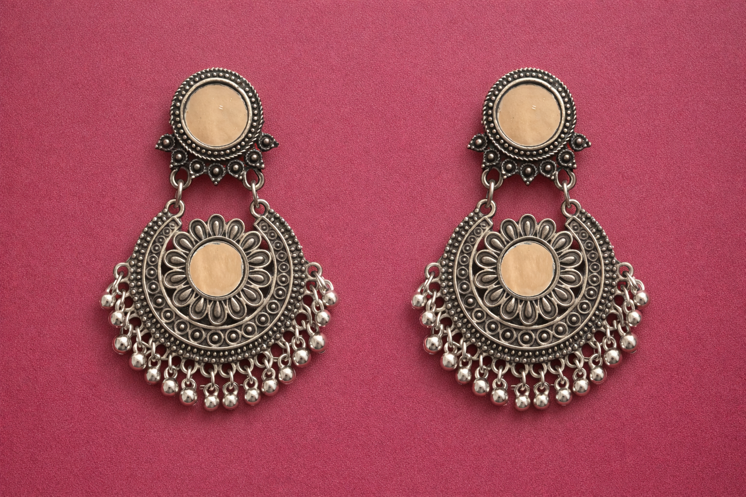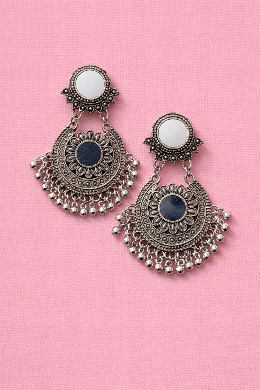 Add timeless charm to your ethnic look with these Oxidized Silver Mirror Work Dangler Earrings. Featuring intricately carved circular motifs with reflective mirror detailing and delicate ghungroo bead drops, these earrings beautifully blend traditional craftsmanship with statement appeal.